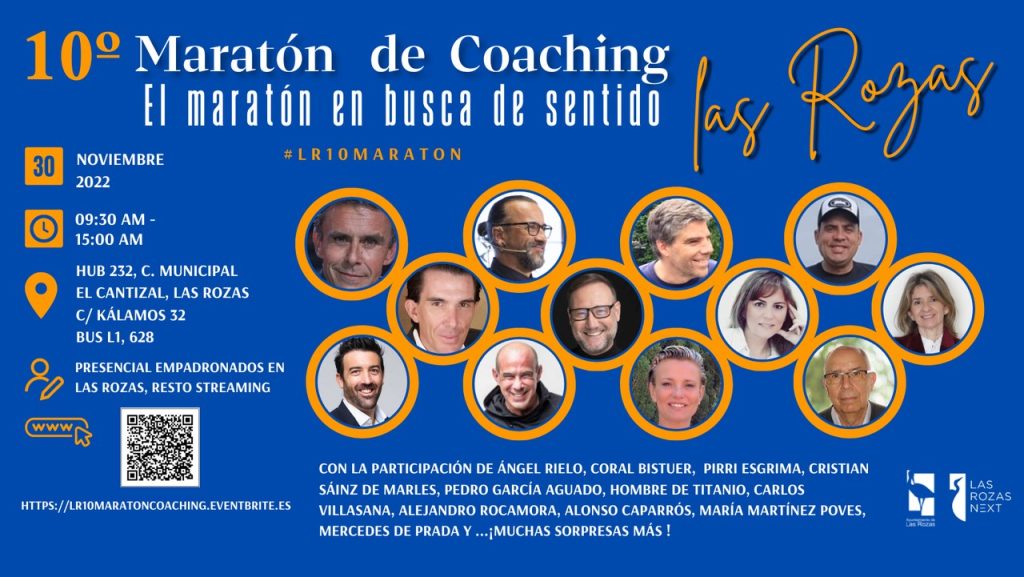 El X Maratón de Coaching, la iniciativa en busca del sentido de la vida del Ayuntamiento de las Rozas, tendrá lugar el día 30 de noviembre, de 9.30 a 15.00 horas, en el edificio municipal el Cantizal, Hub 232, C/ Kálamos 32 de las Rozas.