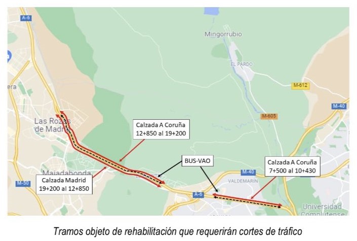 Las actuaciones de rehabilitación superficial del firme correspondientes a los enlaces y la calzada izquierda (sentido Madrid) del tronco de la A-6 entre los PP.KK. 22+200 y 20+700 ya se llevaron a cabo durante el pasado año 2021. Las sucesivas afecciones o cortes de tráfico requeridas, según explica; se irán anunciando a través de la Dirección General de Tráfico conforme vayan avanzando los trabajos.